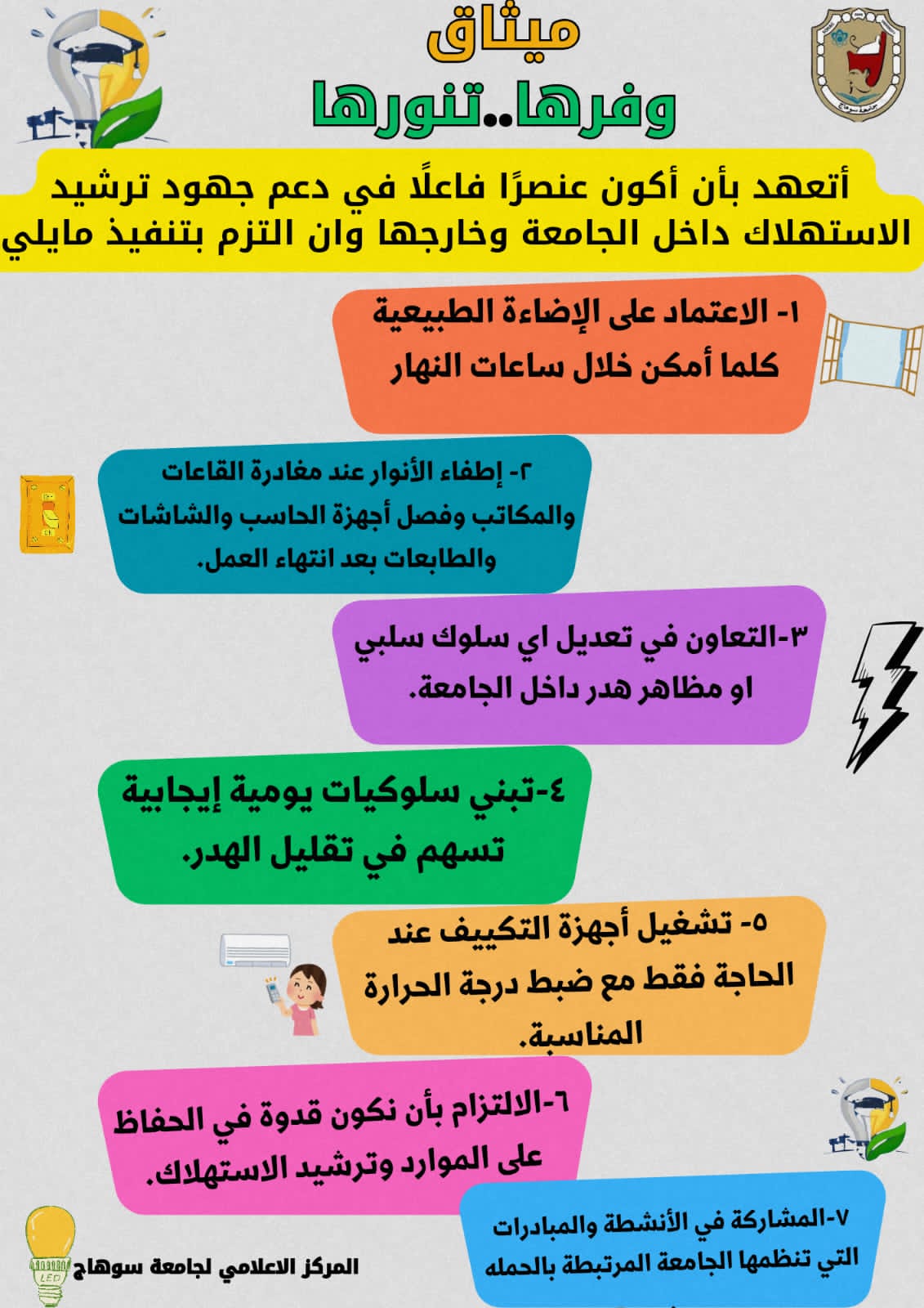 في إطار جهودها لنشر الوعي وترسيخ ثقافة ترشيد استهلاك الكهرباء والحفاظ على الموارد داخل الحرم الجامعي، أطلقت جامعة سوهاج ميثاق “وفرها.. تنورها”، والذي يستهدف جميع منتسبي الجامعة من أعضاء هيئة التدريس والعاملين والطلاب، تأكيدًا على حرص الجامعة على تبني ممارسات مسؤولة تسهم في خفض الهدر وتحقيق الاستخدام الأمثل للطاقة، بما يتماشى مع توجهات الدولة للحفاظ على الموارد للأجيال القادمة.ويتضمن الميثاق عددًا من الالتزامات الأساسية الهادفة إلى تعزيز المسؤولية المجتمعية، وتحويل الجامعة إلى نموذج مؤسسي رائد في كفاءة استخدام الطاقة وترشيد الاستهلاك والحفاظ على البيئة. “أتعهد أن أكون عنصرًا فاعلًا في ترشيد الموارد، وأن أُسهم بسلوكي اليومي في بناء جامعة مستدامة ووطنٍ أكثر وعيًا. والتزم بالاتي :